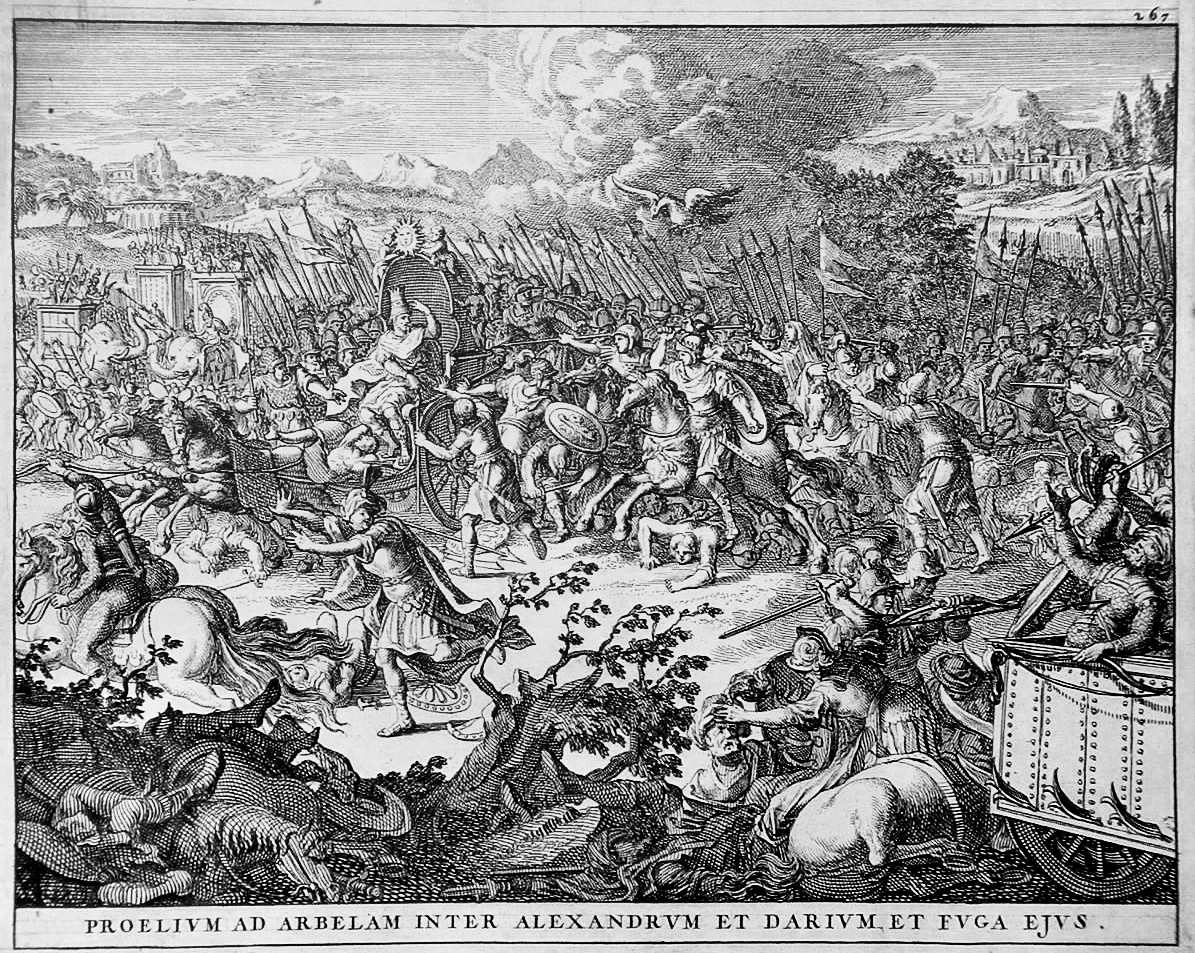 Pourtant, au matin de la bataille, Alexandre, vêtu d’une simple tunique de lin blanc, épée à son flanc et casque à plumes blanches sur la tête, enfourche Bucéphale, son noir destrier, pour passer en revue le front de ses troupes et aller se placer sur son aile droite avec ses Compagnons, cavalerie d’élite dont les membres, issus de l’aristocratie macédonienne, lui sont attachés par un serment de fidélité personnelle. Le plan de Darius est à l’évidence de compter sur le caractère beaucoup plus étendu de sa ligne de troupes, comparé à celle des Macédoniens, pour déborder ces derniers sur leurs ailes et les prendre à revers. Il est donc vital que les ailes du dispositif grec tiennent bon et que le centre ne soit pas enfoncé par les chars, les éléphants perses ou plus sûrement par les bataillons de mercenaires grecs.
